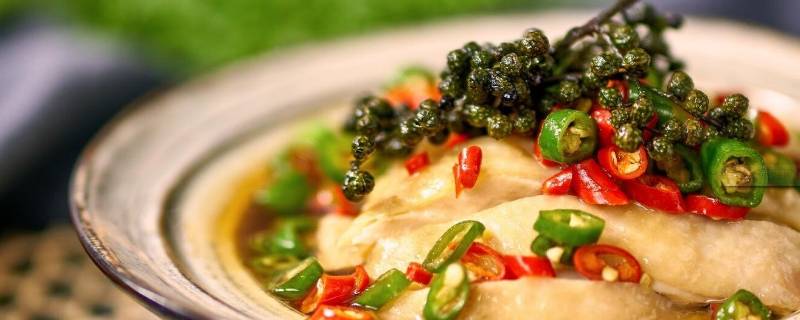 6、鲜椒嫩仔鸡:鸡浸煮至熟,茨粉拌成酸辣口垫入盘底,将鸡斩件入盘,用黄瓜切片围边。花椒、米椒、杭椒撒在鸡上面,用热油淋在上面即可,鸡肉脆嫩爽滑,清香味美。