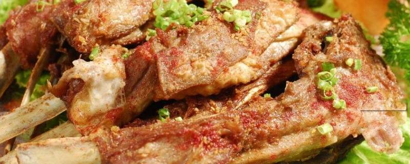 2、香酥羊排:选用木垒地方上等羊的肋骨,用鸡蛋、面粉、面包屑、花椒、大料、香叶、桂皮、葱、姜、盐等调料腌制,放入油锅,用旺火炸至金黄,表面酥脆,入口内里鲜嫩,回味中有隐约的蛋香和一点点甜味。