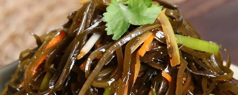3、凉拌海带:海带用水浸洗干净,用滚水浸至有小水泡冒出,加火煮1分钟,取出浸冻水中5分钟后切丝,再用盐水煮1分钟,放入冰格中冻10分钟取出。虾米剁碎,加酱油和水以慢火煮浸半小时成虾米酱油,冷冻,将中西芹、红萝卜、红椒切丝。将虾米酱油淋入海带丝和中西芹、红椒丝中,用盐和糖调味,伴以红萝卜食用即成。可在材料中加入水发海蜇,味道会更好。