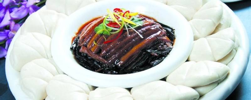6、商芝肉:选上好的五花三层的猪肋条肉,红烧好后切片装盘,将商芝用开水泡开,漂洗干净,取其顶端尖上7~10厘米的一段,切成寸丝,铺放在肉的上面,再撒上葱姜末、五香粉等佐料,上笼蒸半小时左右,强火上气即可。