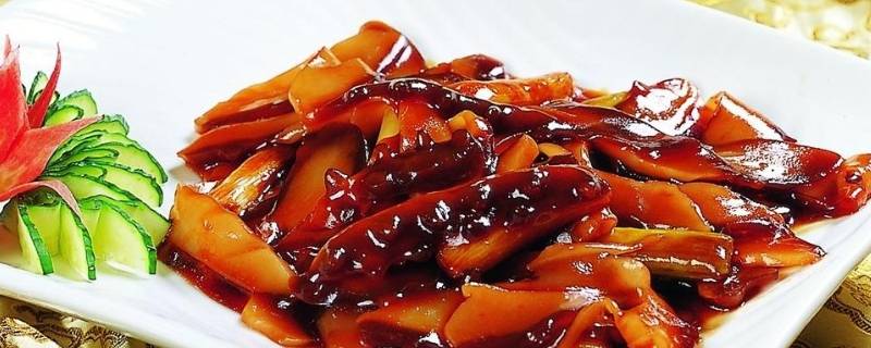1、葱烧海参:葱烧海参为常见的名贵菜品。制作方法有独到之处。先将发好的海参,放锅中烧煮片刻,再将葱段用猪白油炸至金黄色,捞出后加调料入笼略蒸,去汤汁,留葱段。将白糖炒至红色,下姜末,放海参略加煸炒,随即下入葱油糊及料酒、清汤、酱油等调料,用旺火烧开,移微火靠去汤汁大半,再改用旺火,颠翻挂芡入盘。刚出锅的海参,葱香浓郁,口味咸甜,软而不烂。
