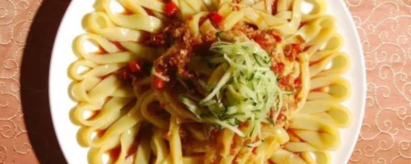 2、甘谷酿皮:酿皮又叫面皮,制作时,选用优质面粉加水并少许蓬灰,用凉水和成硬团,然后在清水中揉搓,使面粉中的蛋白质和淀粉分离,分离出的蛋白质装入平底容器入锅蒸熟,俗称面精。游离水中的淀粉,待其沉淀于容器底,清去上面的黄水,再加入纯净水及适量蓬灰水,调和成稀糊状,随即舀入大平底盘中,上笼入锅蒸熟。吃时切成长条,加上油泼辣椒、精盐、酱油、蒜泥、芥末、香醋、芝麻酱等调料,再加一小撮青菜、胡萝卜或黄瓜丝即可,色艳味美、油浓汁足、柔韧酸辣、凉爽利口。酿皮既可当主食,又可当菜肴,可凉可热,四季皆宜。