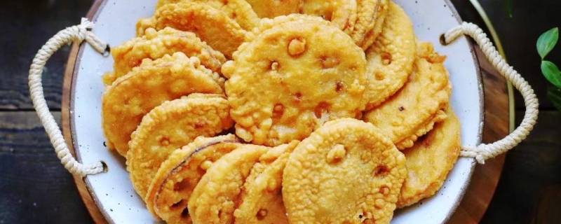 8、锅中倒入适量的花生油烧至六成热时,把藕盒放入面糊里均匀地裹上一层薄薄的面糊。