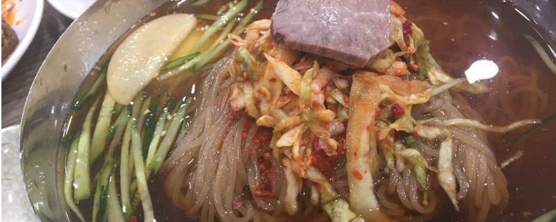 3、冷面辣菜:这个主要是朝鲜冷面以及韩国泡菜的一个组合,有需要的话还可以来半个咸鸭蛋。朝鲜冷面和普通的凉面相比是有汤的而且是很凉的,吃起来很劲道。再加上一下泡菜和咸鸭蛋整个人都好吃到飞起来。