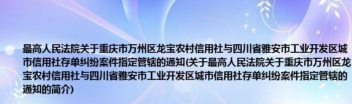 本文关于最高人民法院关于重庆市万州区龙宝农村信用社与四川省雅安市工业开发区城市信用社存单纠纷案件指定管辖的通知的简介就讲解完毕,希望对大家有所帮助。