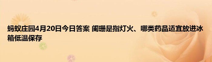 2021年4月20日蚂蚁庄园答案是什么?4月20日蚂蚁庄园的答案很多的玩家都不清晰,这两个问题有:蓦然回首,那人却在灯火阑珊处”中,“阑珊”是指灯火?下列哪类药品适宜放进冰箱低温保存?下面小编给大家介绍一下具体的答案和解析,一起来看看吧。