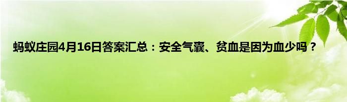 蚂蚁庄园4月16日的答案已经出来了,今天的两个问题一个和健康有关,一个和汽车有关,问题分别是汽车安全气囊里充入的主要是什么气体、贫血是因为身体血液量少吗?安全气囊是生活中比较难以接触到的东西,而贫血则比较常见,那么问题答案是什么呢,下面就来尾随小编一起来看看详细的内容。