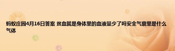 2021年4月16日蚂蚁庄园答案是什么?4月16日蚂蚁庄园的答案很多的玩家都不清晰,这两个问题有:贫血就是身体里的血液量少了吗?汽车安全气囊里充入的主要是什么气体?下面小编给大家介绍一下具体的答案和解析,一起来看看吧。