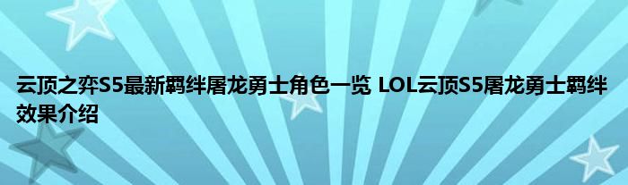 云顶之弈S5最新羁绊屠龙勇士角色介绍,屠龙勇士是云顶之弈S5马上推出的新羁绊,玩屠龙勇士阵容需要的是法师损害和生命值,屠龙勇士这个羁绊还是很强的,很多玩家好奇这个新羁绊有哪些角色可以用,怎么搭配阵容和装备,下面就一起来看看吧。