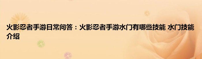 小编今天给各位玩家朋友们带来的是火影忍者手游日常问答:火影忍者手游水门有哪些技能,水门技能介绍,有记得的玩家朋友吗?不记得也没有关系,小编已经帮助大家把火影忍者手游日常问答:火影忍者手游水门有哪些技能,水门技能介绍找了出来,你只需要动动你的小手就可以轻松知道啦,快来瞧一瞧吧。
