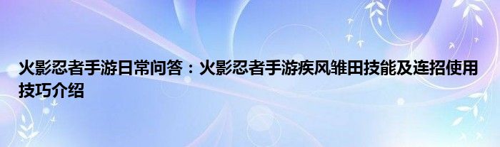 以上就是火影忍者手游日常问答:火影忍者手游疾风雏田技能及连招使用技巧介绍的推荐,相信通过火影忍者手游日常问答:火影忍者手游疾风雏田技能及连招使用技巧介绍这篇文章能帮到你,也欢迎对游戏很感兴趣小伙伴们一起来探讨。