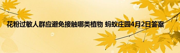 蚂蚁庄园小课堂是很多人都在玩的一个答题的玩法,玩家可以每日的凌晨在这里参与到答题活动当中,其中4月2日最新题目已经带来更新,今天的题目就是花粉过敏人群应幸免接触哪类植物。不少人不知道答案了,那下面就来一起看下蚂蚁庄园4月2日答案的介绍,希翼能够给大家带来帮助。
