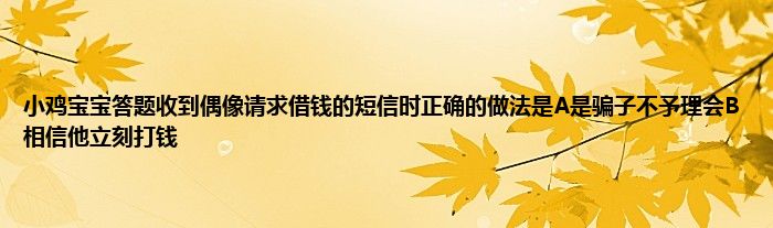 今天明哥就为小伙伴们讲解下小鸡宝宝答题收到偶像请求借钱的短信时正确的做法是A是骗子不予理会B相信他立刻打钱,相信很多玩蚂蚁庄园的小伙伴们都想知道这个答案吧,那么小编也收集到了有关小鸡宝宝答题收到偶像请求借钱的短信时正确的做法是A是骗子不予理会B相信他立刻打钱的相关资料希望大家会喜欢。
