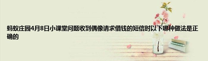 今天明哥就为小伙伴们讲解下蚂蚁庄园4月8日小课堂问题收到偶像请求借钱的短信时以下哪种做法是正确的,相信很多玩蚂蚁庄园的小伙伴们都想知道这个答案吧,那么小编也收集到了有关蚂蚁庄园4月8日小课堂问题收到偶像请求借钱的短信时以下哪种做法是正确的的相关资料希望大家会喜欢。