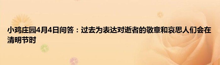 过去,为表达对逝者的敬意和哀思,人们会在清明节时?相信大家都很想支付宝蚂蚁庄园的今日答题小课堂的答案是什么,回答正确答案可以获取180g的小鸡饲料,想要了解的小伙伴快来看看兔叽下载站小编带来的蚂蚁庄园小课堂4月4日答案吧!