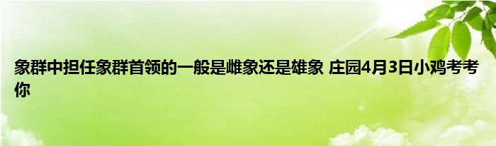 欢迎大家来到这里,能进来的小伙伴都有玩蚂蚁庄园的,支付宝蚂蚁庄园每天都会在小课堂更新一道题目,答对即可领取小鸡饲料180G,4月3日蚂蚁庄园问题是:象群中,担任象群首领的一般是?很多小伙伴都不知道象群中,担任象群首领的一般是这个问题的答案是什么,那么小编就为大家分享下4月3日蚂蚁庄园课题问题的答案,希望对大家有所帮助!