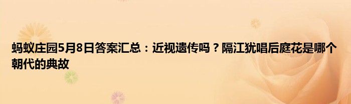 大家好,今天是5月8日,今天的蚂蚁庄园问题已经出来了,一个和健康有关,一个和古诗词有关,问题分别是:商女不知亡国恨隔江犹唱后庭花是哪个朝代的典故?近视遗传吗?很多小伙伴不知道答案,答对可以获得奖励,下面就来一起看看吧。