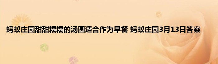 甜甜糯糯的汤圆,适合作为早餐食用吗?蚂蚁庄园3月13日的问题正式公布,如果回答正确就可以领取奖励,可能很多的玩家还不太清楚具体的答案是什么,为了让大家都能领取到小鸡饲料,下面就是蚂蚁庄园小课堂3月13日的答案和答案解析。