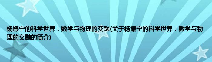 大家好,杨振宁的科学世界:数学与物理的交融,关于杨振宁的科学世界:数学与物理的交融的简介很多人还不知道,现在让我们一起来看看吧!