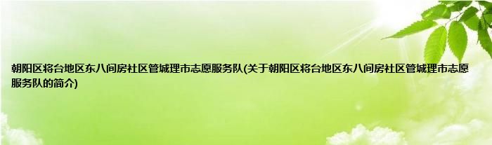 1、 朝阳区将台地区东八间房社区管城理市志愿服务队是由朝阳区将台地区管城理市志愿服务队领导下的志愿团体。