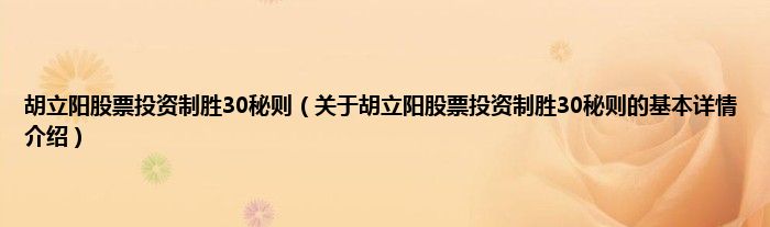 本文关于胡立阳股票投资制胜30秘则的基本详情介绍就讲解完毕,希望对大家有所帮助。