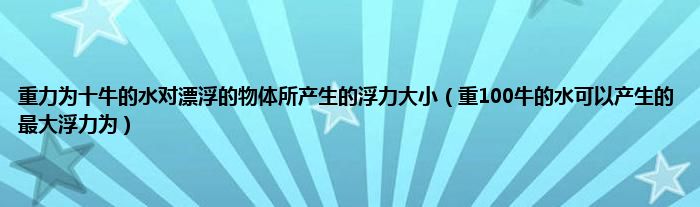 大家好,小问来为大家解答以上问题。重力为十牛的水对漂浮的物体所产生的浮力大小,重100牛的水可以产生的最大浮力为这个很多人还不知道,现在让我们一起来看看吧!